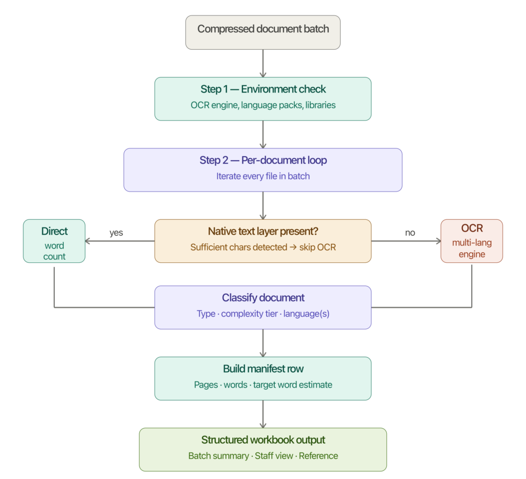 Batch Analyzer – Ingests a compressed document batch, runs OCR where needed, classifies each file by type and complexity, and outputs a structured workbook ready for quoting and assignment.