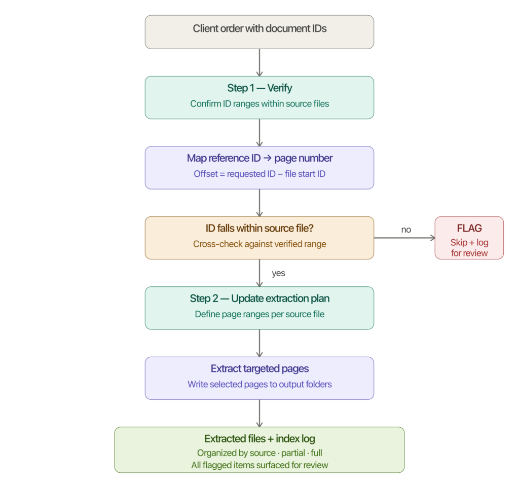 Batch Extractor – Takes a client order specifying document IDs, maps each ID to a physical page within the source files, flags any unresolvable references for review, and extracts only the targeted pages into organized output folders.